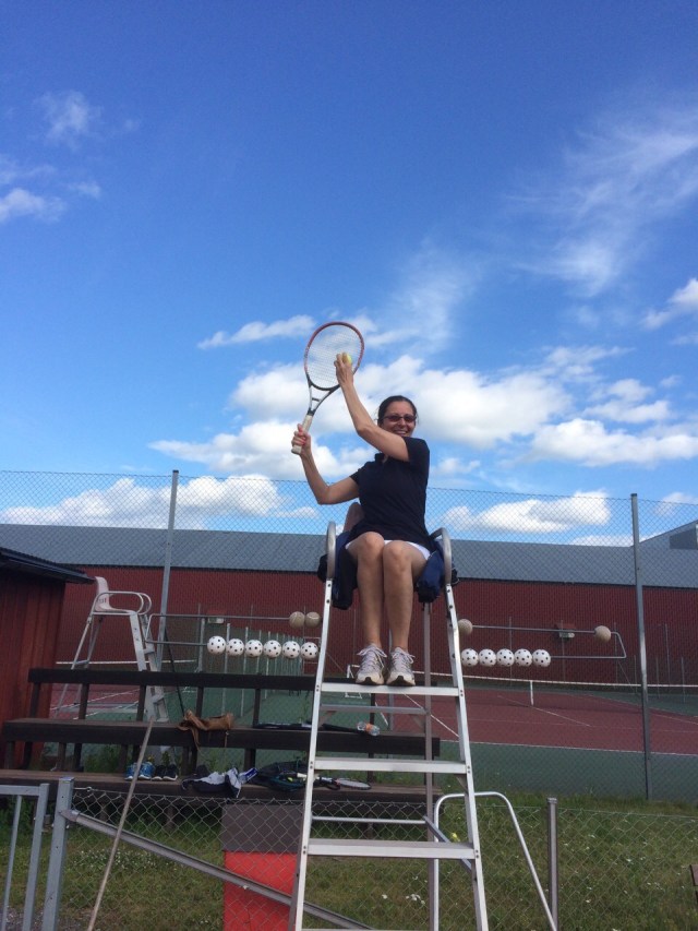 Inspirerade av Wimbledon begav vi oss till tennisbanan idag. Sonen, maken och jag. Min oanvända tenniskjol åkte fram. Äntligen kommer den luftas. Inköptes för många år sedan. Grabbarnas dåvarande tränare avkrävde oss föräldrar en nybörjarkurs. Vi skulle känna på hur svårt det kan vara att spela tennis. Vanligtvis stod vi på läktaren och hade åsikter om spelet på banan. Nu fick vi istället lära oss spelets grunder själva. Den kursen är min enda egna tenniserfarenhet. Och så dagens insats typ 10 år senare. Slog några bollar och dömde sedan grabbarnas match. Junior vann som sig bör över senior. Precis som det ska vara.