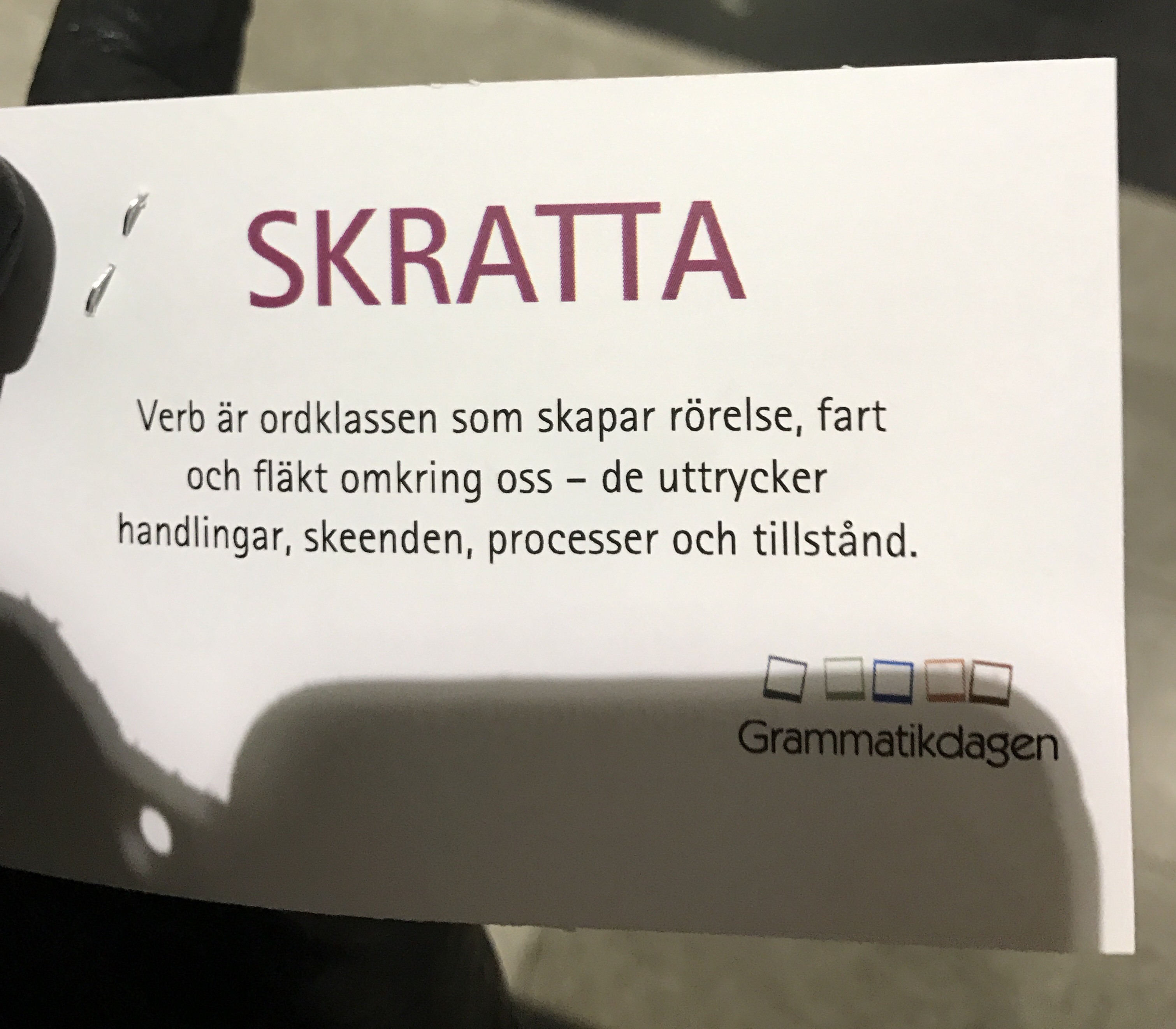 Idag är visst grammatikens dag. Uppmärksammades om den när jag fick denna lilla lapp i handen. En liten trevlig marknadsföringskupp av Språkkonsulterna. Både ordklassen och ordet känns som jag. Ska ta budskapet som en uppmaning inför helgen. Skickar vidare den till er med en önskan om en trevlig helg full av rörelse och skratt!