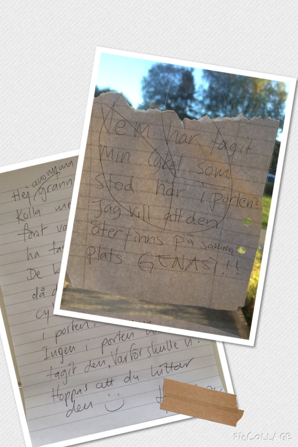 Såg en lapp imorse på vägen ut. En anonym granne som saknar sin cykel vill GENAST ha tillbaka den. Lappen antyder att någon i porten har flyttat på cykeln.